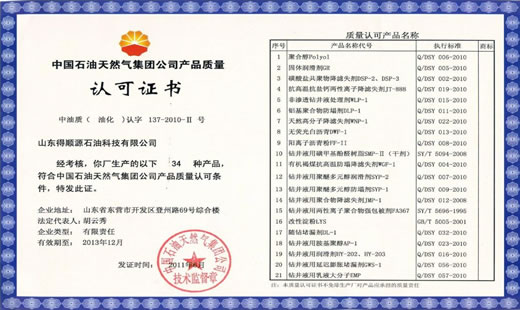 公司建立了先進完善的內(nèi)控體系和質(zhì)量控制體系,通過了API spec Q1及API 13A認(rèn)證、ISO9001質(zhì)量管理體系認(rèn)證、14001環(huán)境體系認(rèn)證、18001職業(yè)安全健康體系認(rèn)證、HSE健康安全環(huán)保體系認(rèn)證和CNPC油田化學(xué)劑質(zhì)量認(rèn)證。